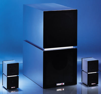 Visaton Nano Sub (Nano Sat MKII kit shown left and right are not included) - shown assembled with suggested cabinets, not supplied.