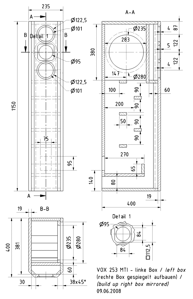 Fitting the TIW 250 XS into the side is a special feature. The mounting board for the TIW 250 (380 x 283 with a 235 mm cut-out) itself is glued in place from inside behind the cut-outs in the corresponding side-wall. This means that the bass driver can be recessed by 19 mm (19 mm = thickness of the boards). For optical reasons the side-wall cut-out must be made extremely accurately.